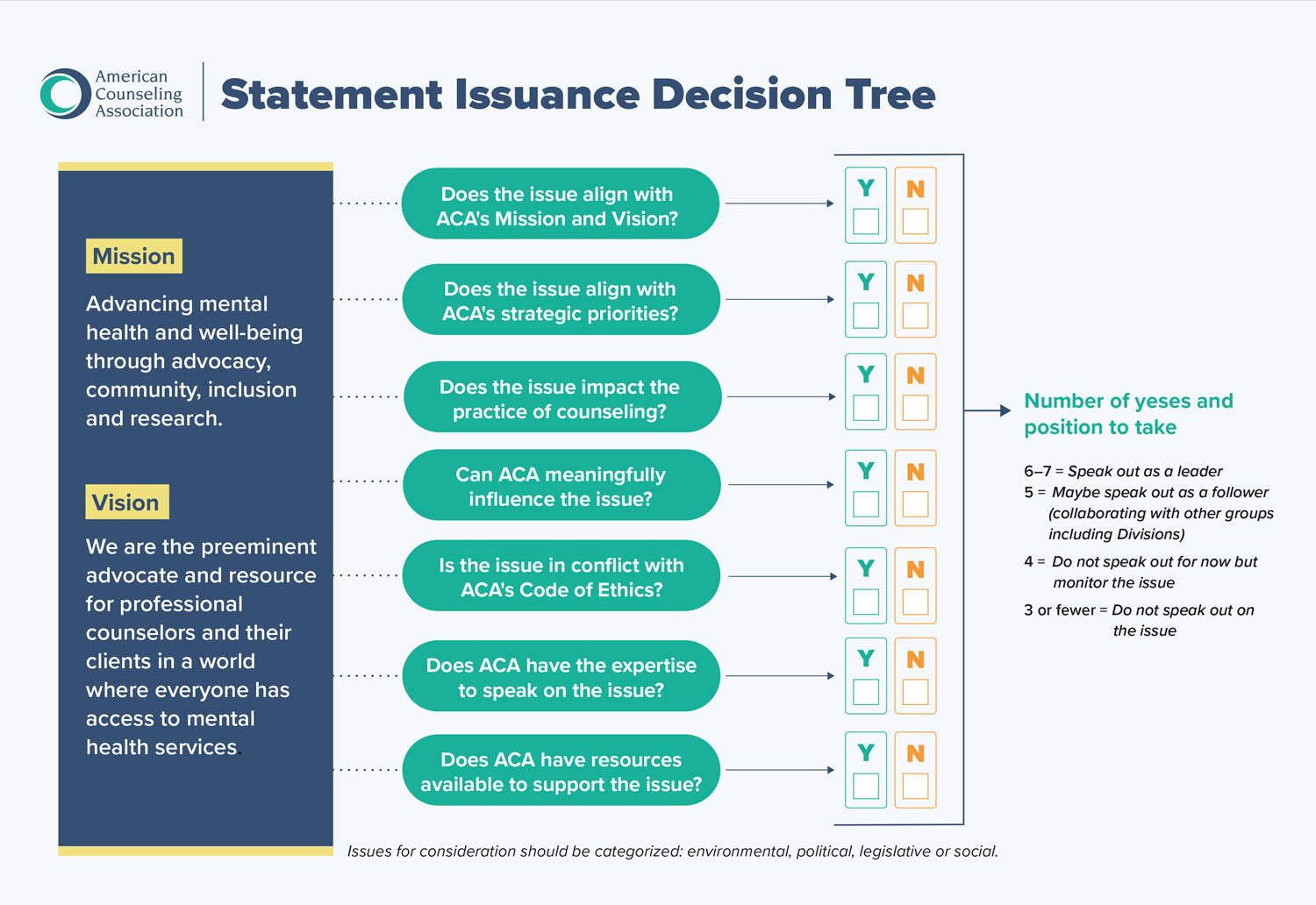 ACA, like many associations, wrestles with issuing public statements in response to myriad domestic and global issues. To help guide our decision-making process, we have developed the framework below, which was approved by ACA's Governing Council in April 2024. The framework helps ACA leaders decide when to speak out, defer to other experts in our community or monitor the issue.